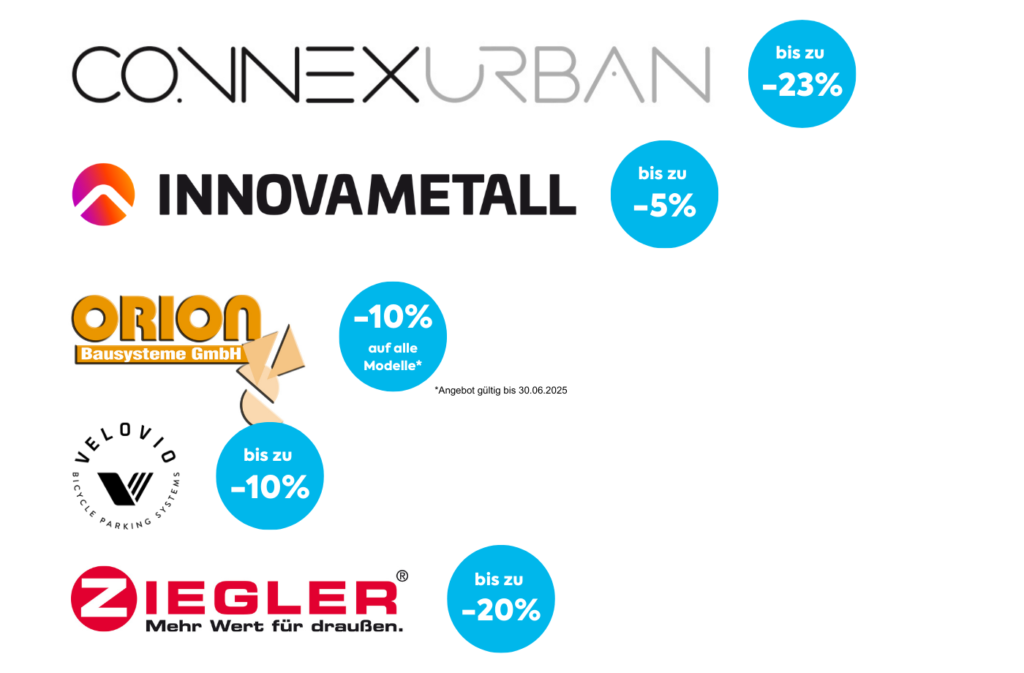 Nicht im Folder ist die Aktion der Firma Orion: 10 % Rabatt auf alle Fahrradparker der Firma Orion – gültig für Bestellungen bis zum 30. Juni 2025.