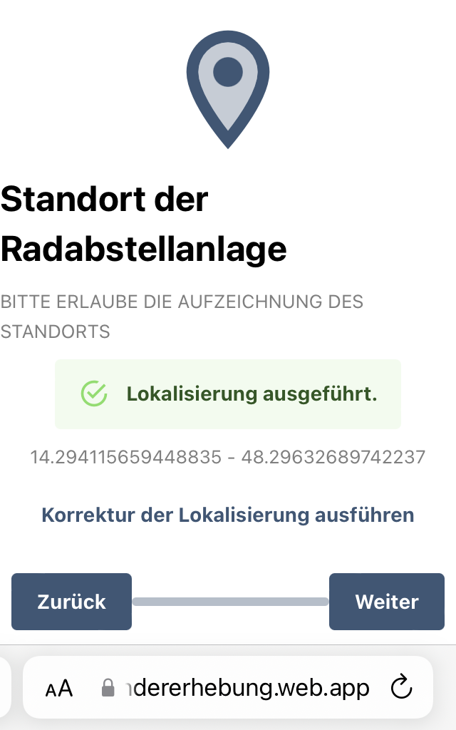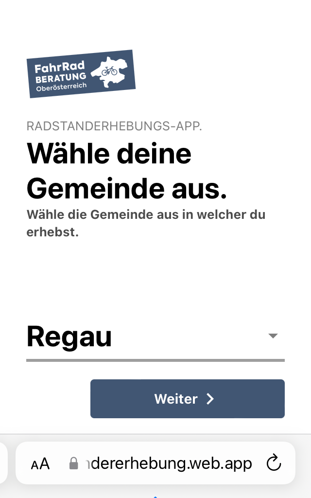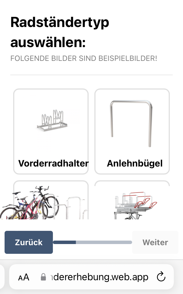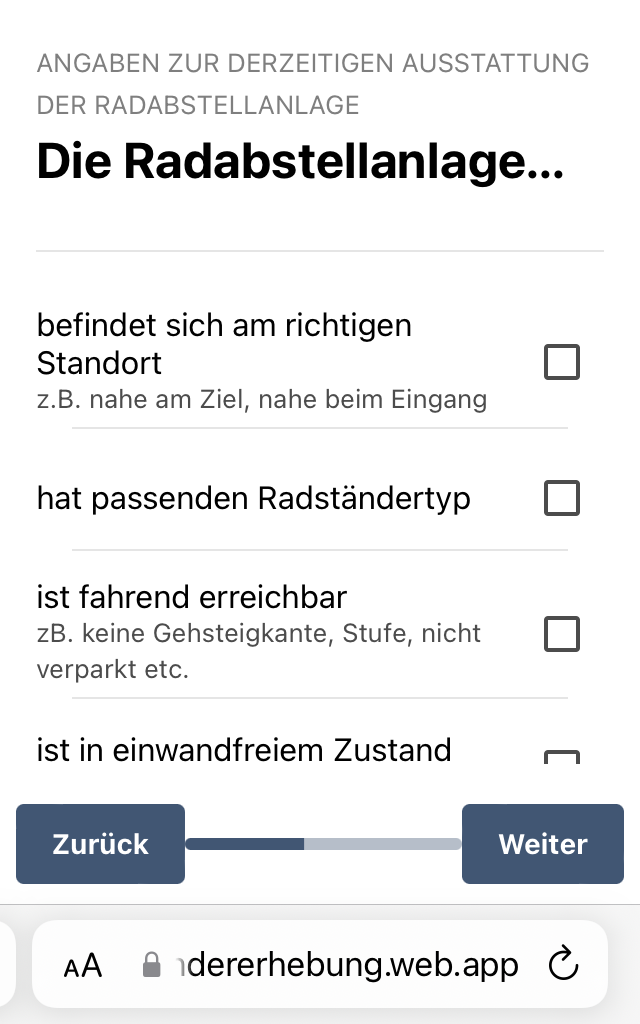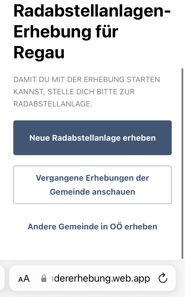- App auf radstaendererhebung.web.app öffnen und zum Standort der Radabstellanlage begeben